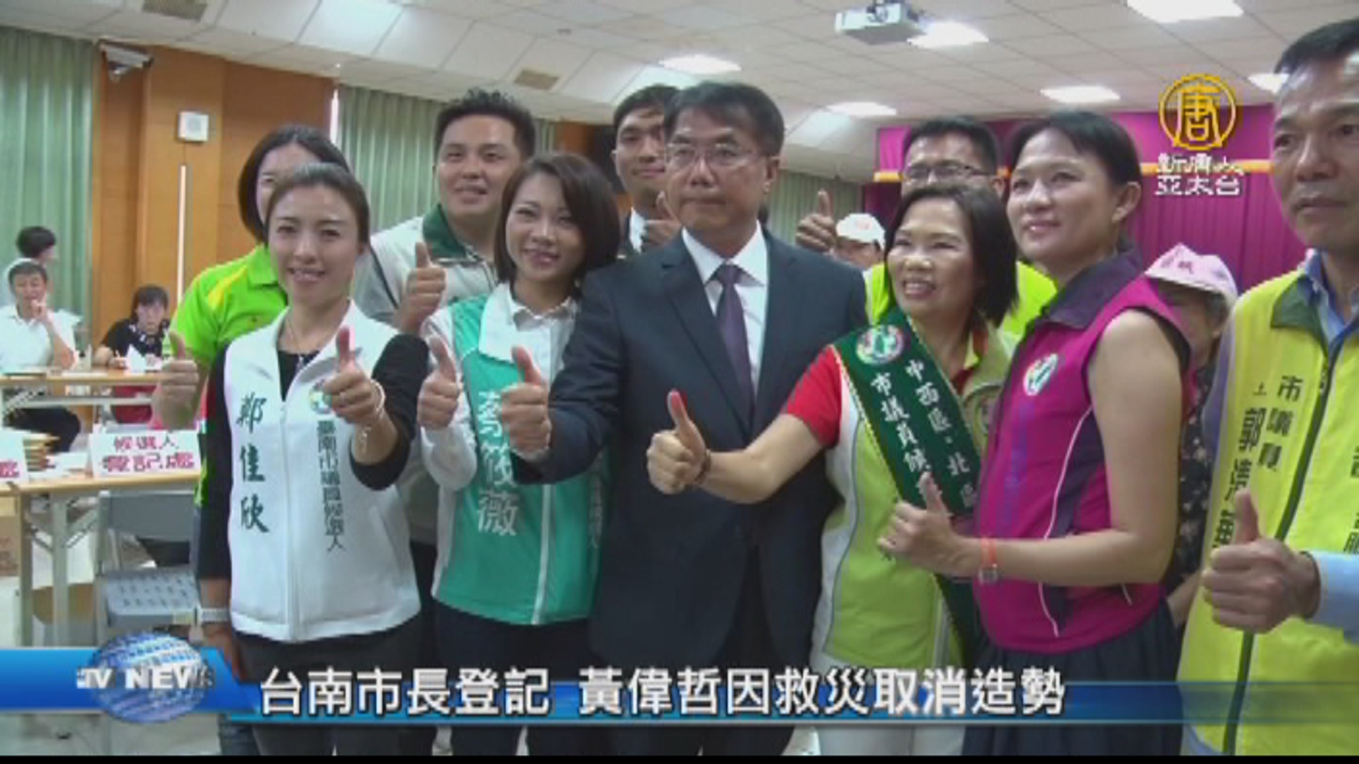 民進黨提名參選人 黃偉哲:「今天是帶著很謙卑的心情來完成,第三屆直轄市市長候選人的登記,由於前一陣子的天災超大雨量,目前為止我們還在幫忙救災幫忙勘災之中,所以原定的造勢活動我們通通一律取消。」