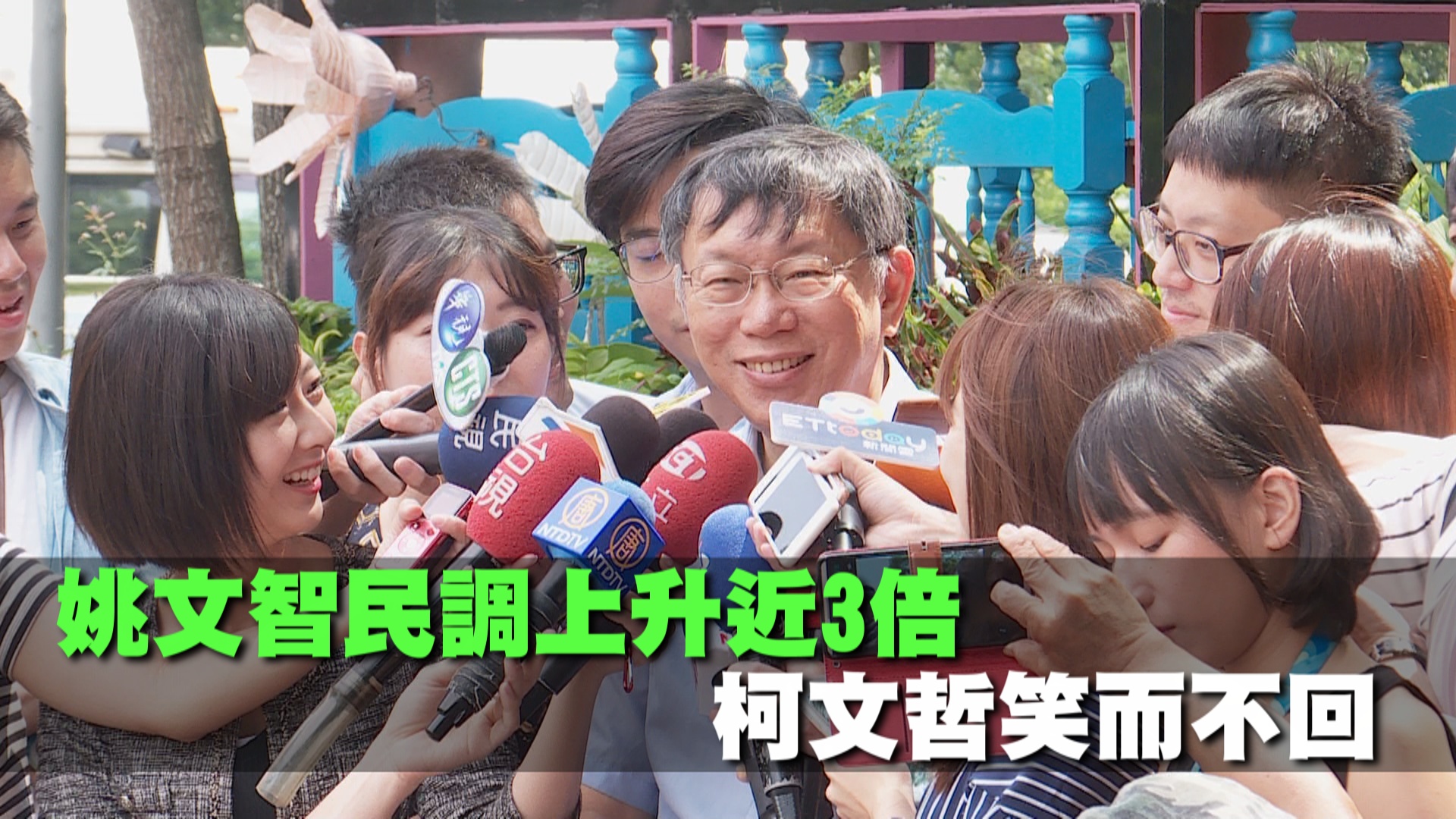 【新唐人亞太台 2018 年 09 月 02 日訊】台北市長選戰最新民調指出,民進黨台北市長候選人姚文智民調爬升,支持度從5.3%暴衝到14.9%,不過還是落後台北市長柯文哲的33.43%,和國民黨丁守中的24.71%,對於姚文智民調上升近3倍,柯文哲笑而不回。