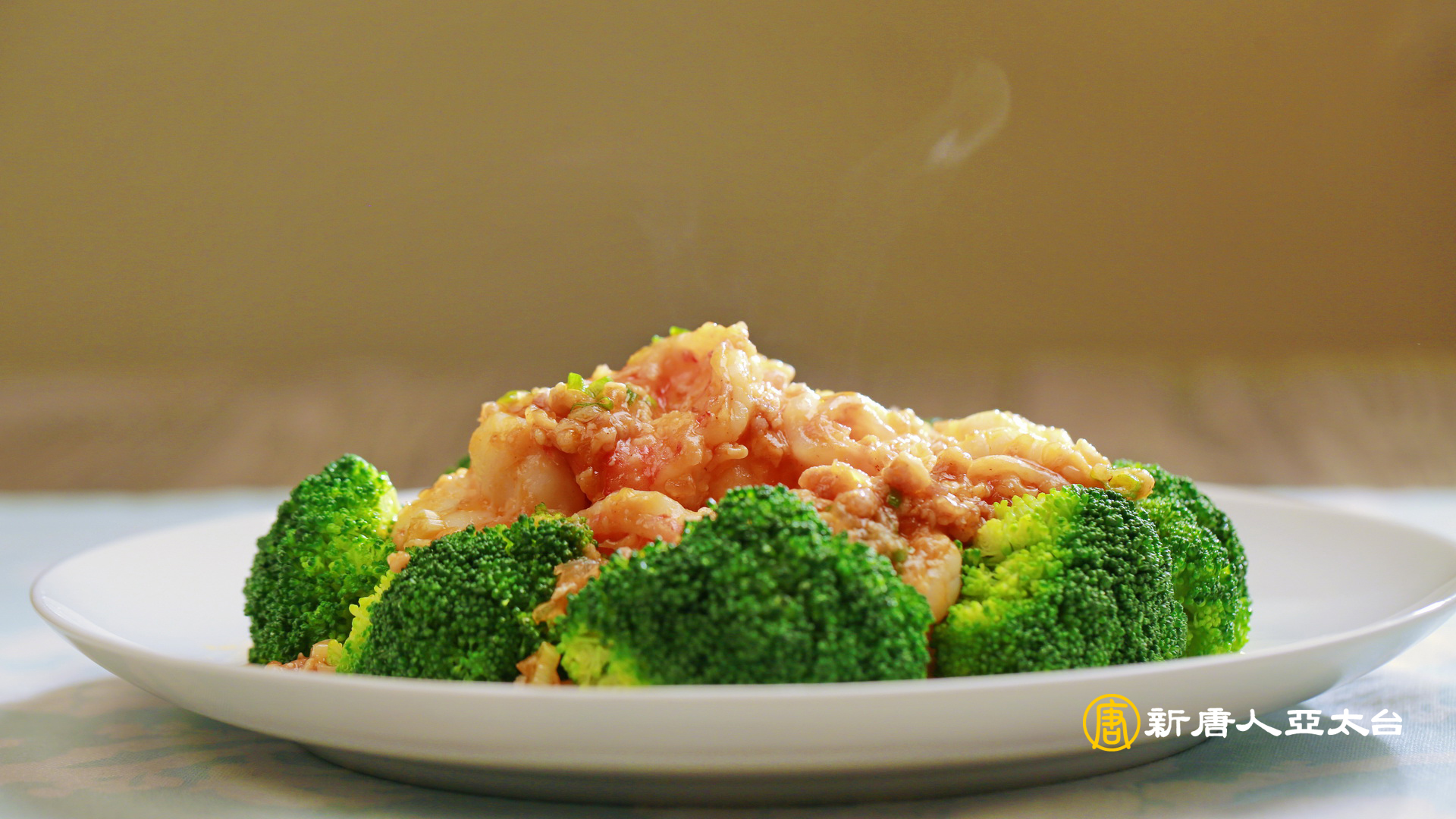 4. 薑蔥蒜爆香>入絞肉、酒釀、蕃茄醬、鹽、水、紹興酒>蝦球>拌炒>一點太白粉水勾芡>加香油、蔥花>盛入盤中>花椰菜圍邊