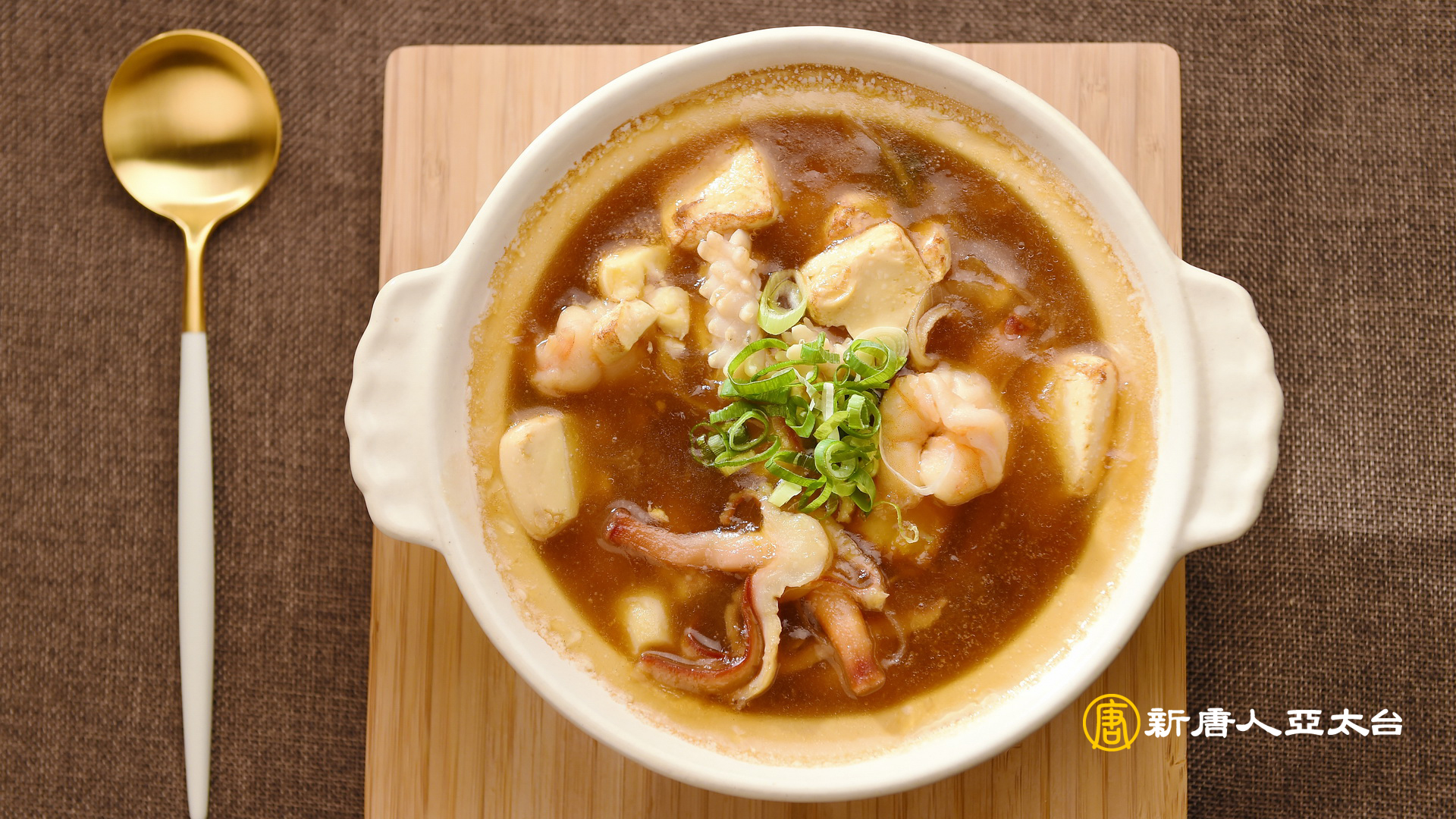 食材:芙蓉豆腐一盒、中卷30g、蝦仁4隻、蘭花蚌20g、蔥段5支、蒜仁3顆、洋蔥絲10g