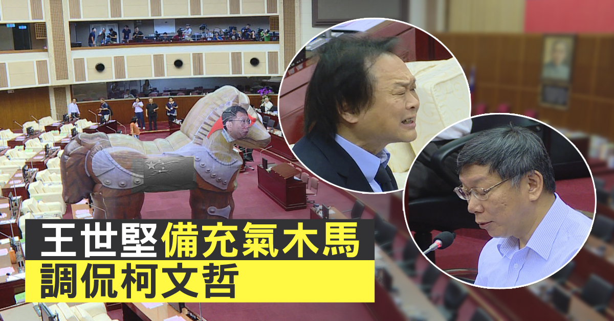 台北市議會裡,架起一座兩層樓高的巨型充氣木馬,上頭貼了中共五星旗與柯文哲的照片。議員王世堅批評柯文哲對中共的態度,已成為中共木馬屠城的代言人。