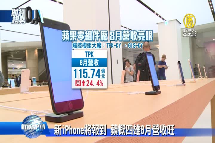 【新唐人亞太台 2018 年 09 月 08 日訊】好,蘋果新品發表會,將在下周台北時間,9月13日登場,外界聚焦新品iPhone,還有周邊產品,筆電,穿戴裝置,也推陳出新。國內供應鏈,8月營運增溫,像是觸控大廠的宸鴻(TPK),營收就創下33個月新高。