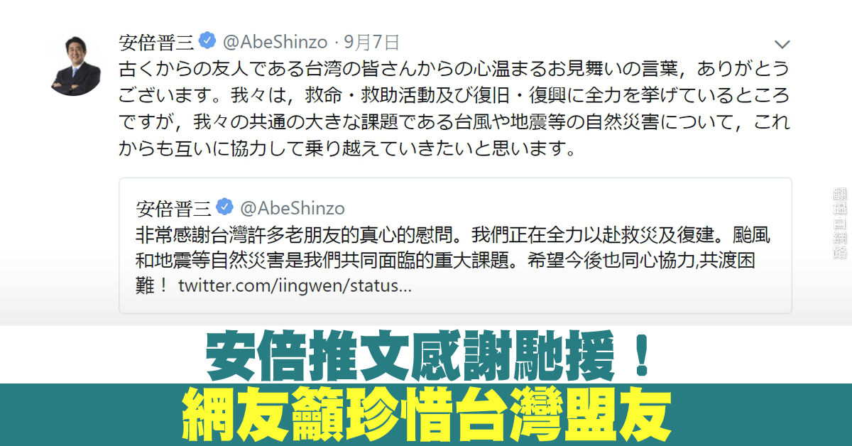 安倍推文感謝馳援!網友籲珍惜台灣盟友