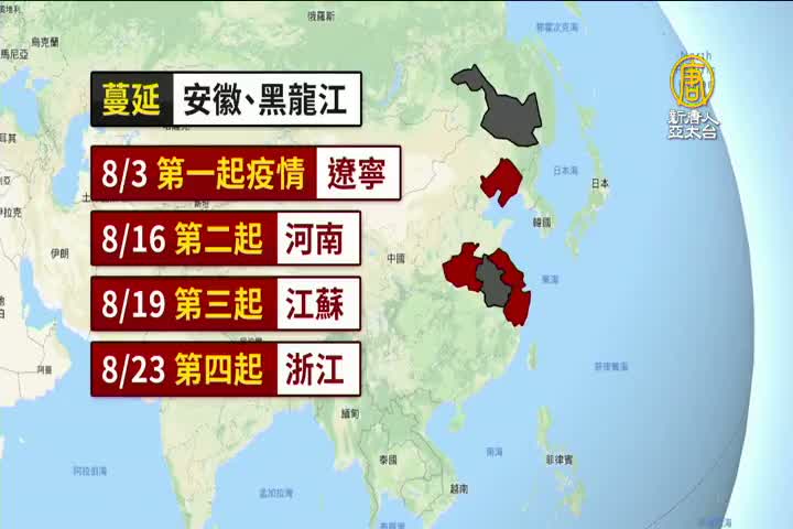 疫情8月爆發,8月3日從遼寧開始,接著河南、江蘇、浙江都中鏢,蔓延到安徽及黑龍江等地,擴及六省14起。