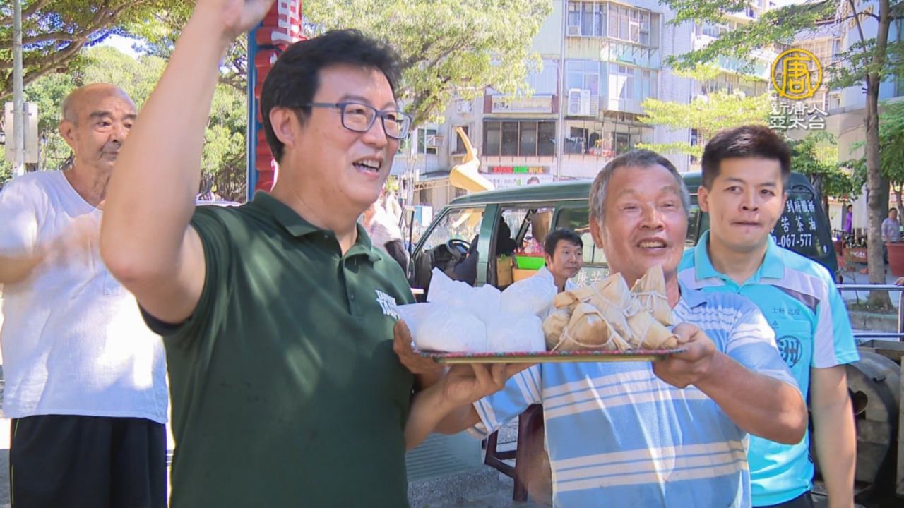 送上包子、肉粽,預祝「包中」,姚文智回到自己發跡的選區,北投的石牌市場,感受到選民溫暖,心情好到當場揮毫。