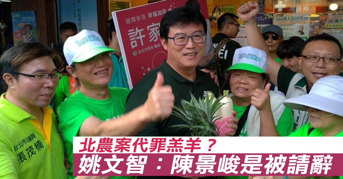【新唐人亞太台 2018 年 09 月 14 日訊】好,台北副市長陳景峻召開記者會,宣布請辭北農董事長。對此,台北市長候選人姚文智,下午表示,陳景峻是整件事的代罪羔羊,據他了解是被請辭。