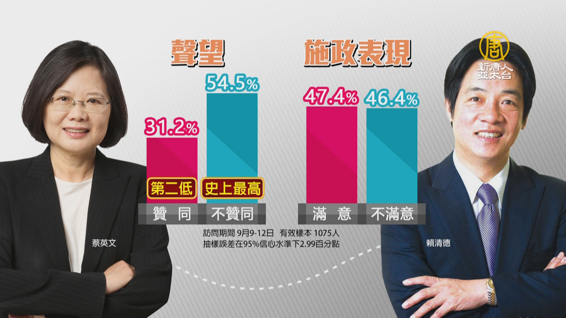 【新唐人亞太台 2018 年 09 月 17 日訊】在8月的南部水災和我國和薩爾瓦多斷交之後,最新民調指出,蔡總統的聲望依舊在低檔徘徊,滿意度是31.2%,不過賴清德有微幅上揚,比起上次死亡交叉,現在滿意度47.4%,高於不滿意度46.4%,學者就說他是最耐磨耐操的行政院院長。