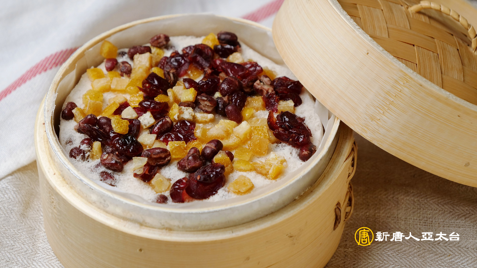 5. 把鬆糕分二次倒入蒸籠內,鋪滿後上面再撒上水果蜜餞及蜜紅豆粒