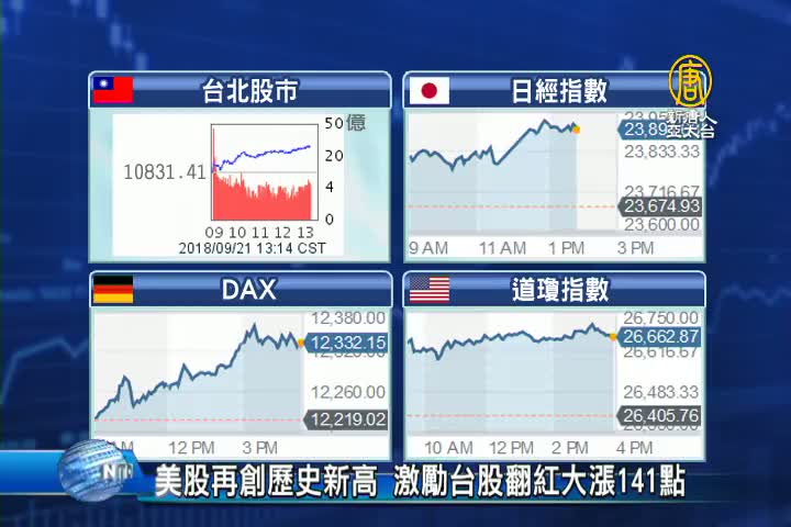 【新唐人亞太台 2018 年 09 月 21 日訊】來關心台股, 美股周四表現強勁,道指、標普500指數收盤雙雙創新高。台股加權指數今天一早開高25.69點,雖然電子股中,蘋概股表現疲弱,但在傳產股強勢拉抬、金融股穩盤下,指數隨後走揚站上10900點,收復季線、月線等所有均線。尾盤在台積電、鴻海、大立光帶動下,終場大漲141點。