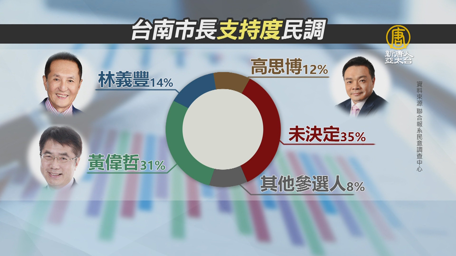 從這份民調顯示,黃偉哲還是穩居龍頭,而林義豐、高思博的支持度各是14%及12%,其他參選人加起來約有8%,而有35%的人還沒決定要投給誰。