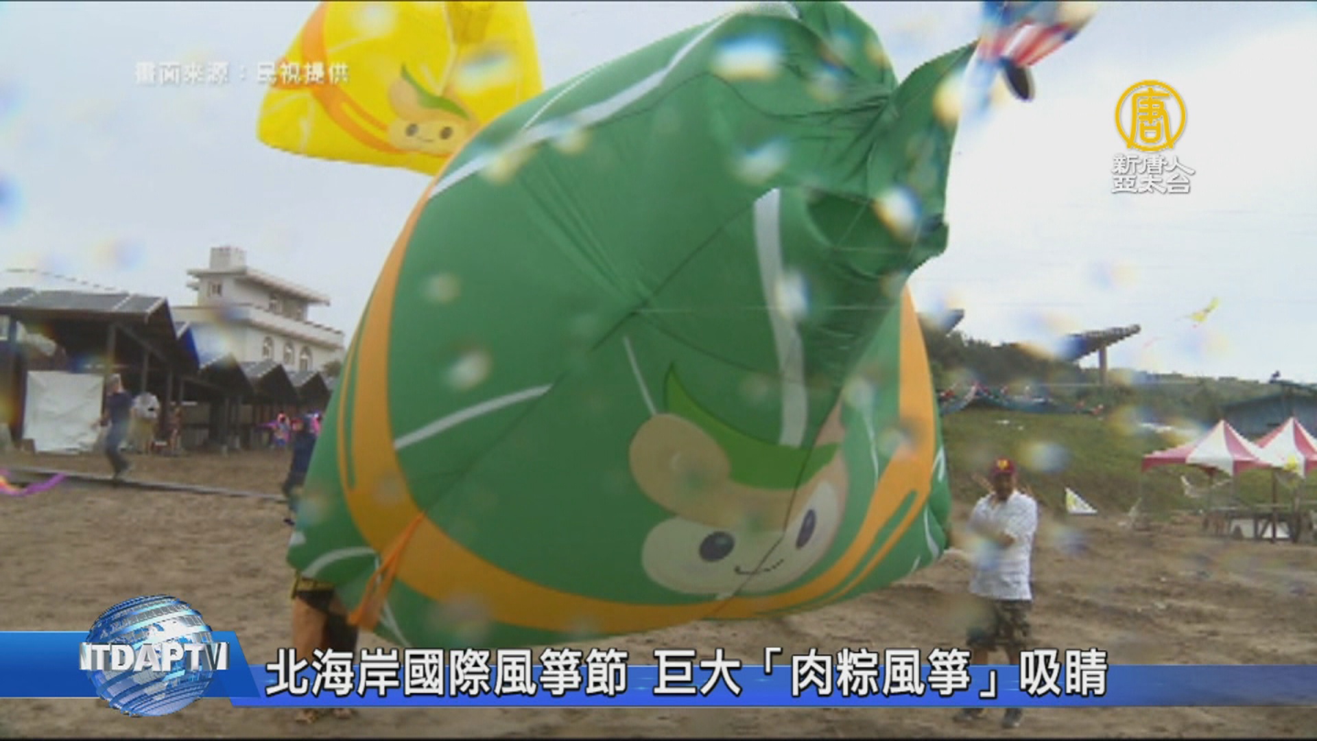 【新唐人亞太台 2018 年 09 月 27 日訊】一年一度的新北市「北海岸國際風箏節」,將在29日登場,比賽前的熱身賽出現許多造型的風箏,吸引眾人的目光,其中搭配今年選舉年,還有石門特色美食「粽子」,主辦單位特別製作一個超大型的「肉粽風箏」,希望以「包粽」的好彩頭來預祝活動順利成功。