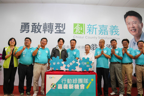 翁章梁競選總部成立大會,首先由行政院長賴清德、立委陳明文、蔡易餘等人,共同轉動「中央、嘉義縣、行動綠團隊」三個齒輪,象徵中央地方攜手合作,帶領地方勇敢轉型、創新嘉義。