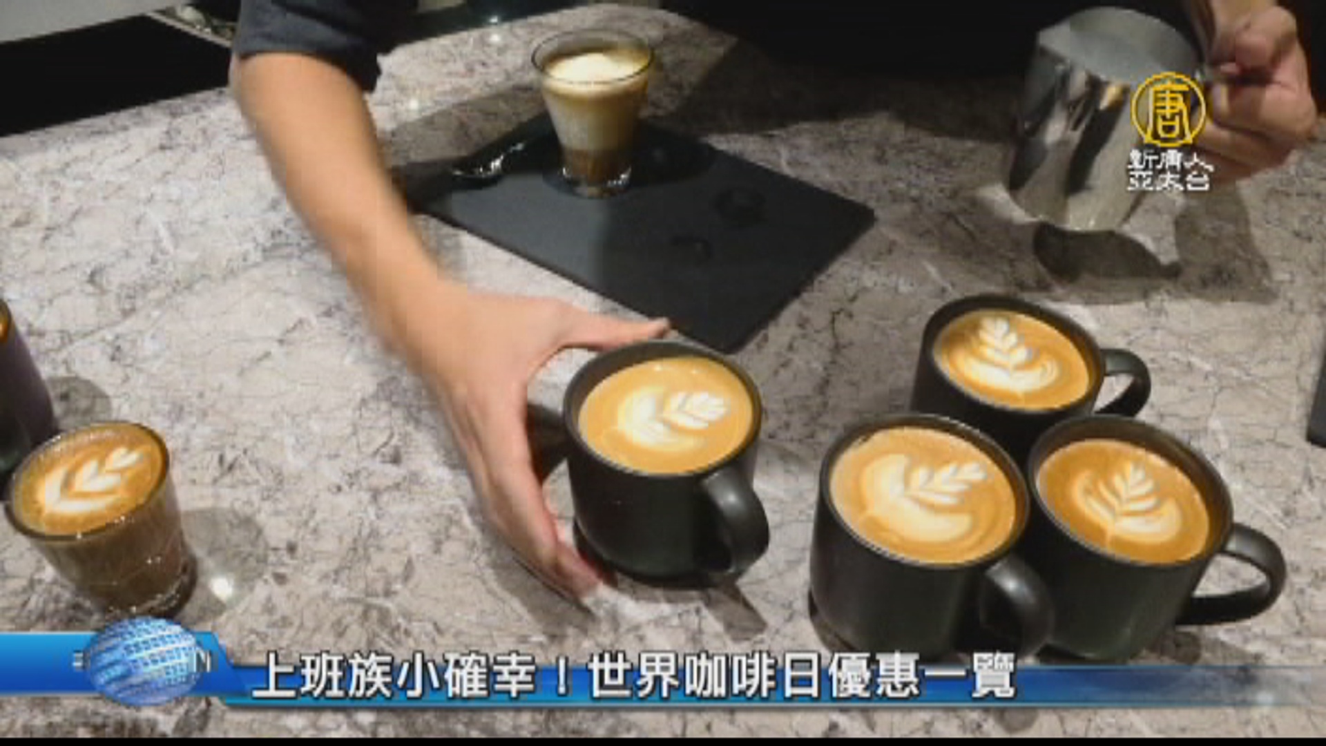 【新唐人亞太台 2018 年 10 月 01 日訊】10月1日是世界咖啡日,今天多家咖啡業者也推出優惠, 像是,星巴克的指定品項買一送一。伯朗咖啡則是不限品項,全都買一送一。CAMA則是推APP活動,送顧客中杯黑咖啡兌換券。另外,全家超商也推出,任選咖啡品項第2杯7折優惠。業者咖啡日做促銷,也為愛喝咖啡的上班族,趕走憂鬱星期一。
