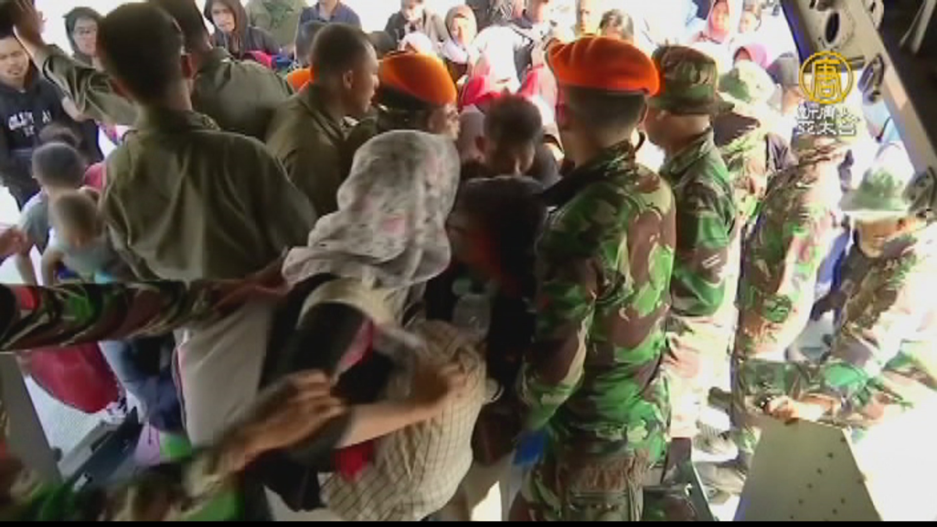 週一,重災區帕盧市已受損的機場,擠進大批災民,希望能夠搭上軍用飛機或商業飛機離開。