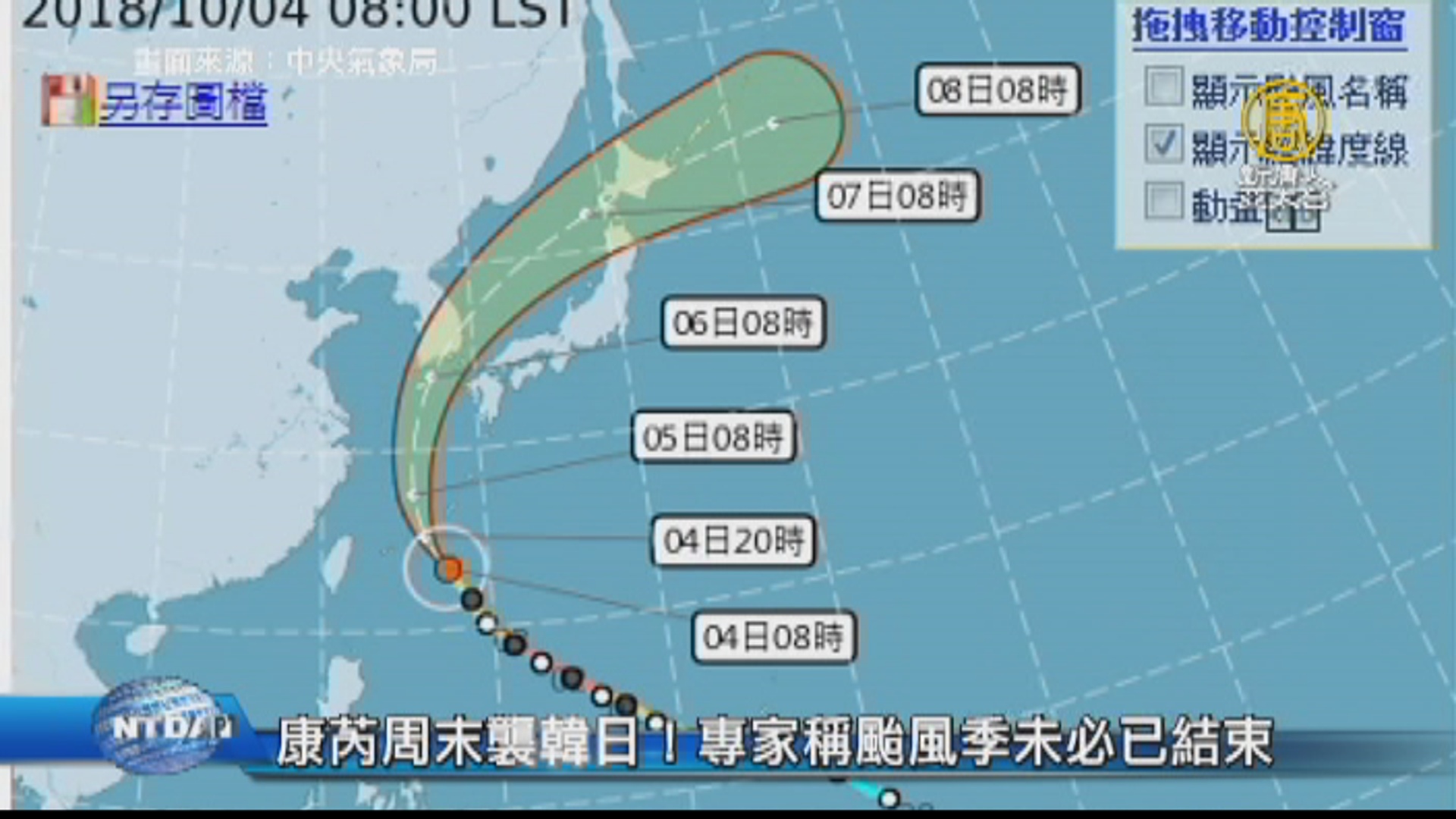 【新唐人亞太台 2018 年 10 月 04 日訊】午報頭條,先來關心,中度颱風康芮。從今天到明天凌晨,受康芮外圍環流影響、台灣北部、東北部雨勢增大,另外,這個週末康芮將襲韓國、日本,氣象專家吳德榮在專欄指出,侵襲韓國時減弱為輕颱,通過日本北部時則將轉變為溫帶氣旋。吳德榮還說今年的颱風季未必已經結束,過去11月、12月,都曾經有過颱風侵台的記錄,所以無法預測今年的狀況。