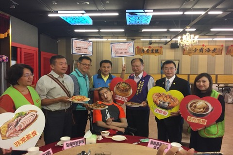 胡椒蝦始祖賴秋基(左二)在餐廳公益餐會的宣傳活動,與員林市長張錦昆(左四)、埔心鄉長張乘瑜(左三)、餐廳董事長張文彥(右二)一起將香氣四溢的「胡椒蝦」獻給植物人與家人,為他加油打氣(創世彰化分會提供)