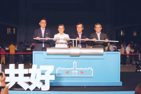 副總統陳建仁(左二)、文總副會長江春男(右二)、秘書長林錦昌(左一)、內政部次長花敬群(右一)共同出席,一同點燈並觀看首場光雕展演,祝台灣一起共好(中華文化總會提供)