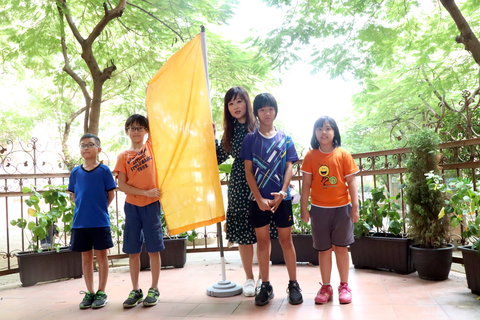 高雄市民權國小升起代表對敏感族群不健康的「橘色」空汙旗。(高市教育局提供)