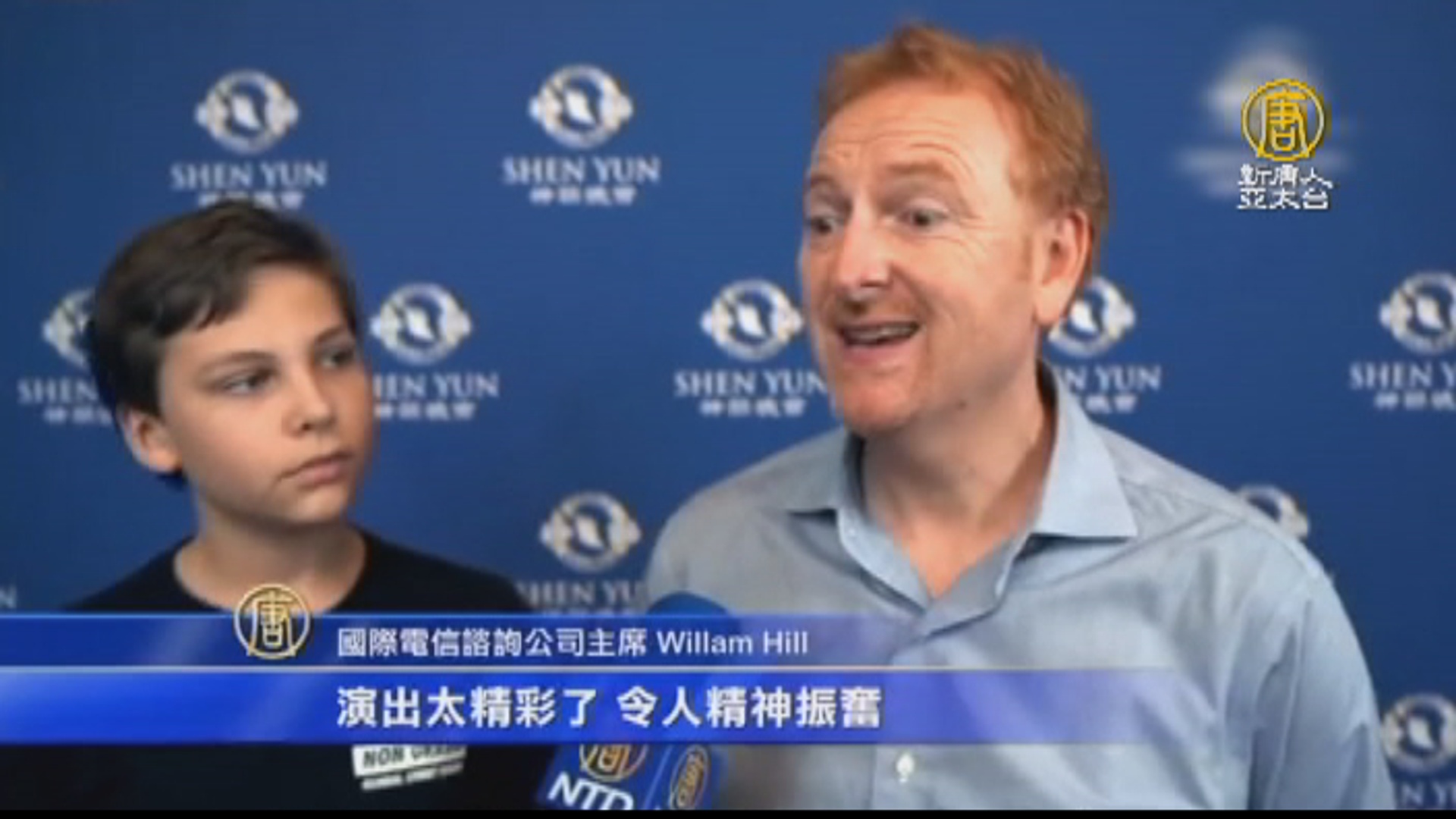 國際電信諮詢公司主席 Willam Hill:「演出太精彩了!令人精神振奮,我很喜歡神韻中西合璧的交響樂。中國樂器演奏的旋律,是非常古老的樂音,真是太棒了。你能感受令人振奮的能量。」