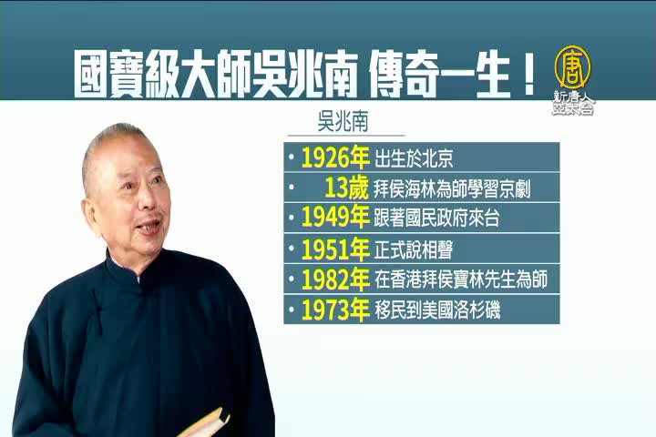2012年返台演出的吳兆南,也特別用相聲跟新唐人的觀眾朋友拜早年。如今,吳兆南的相聲人生落幕,但一代相聲大師的傳奇身影,依舊在眾人的腦海中,留下永遠的國寶相聲。