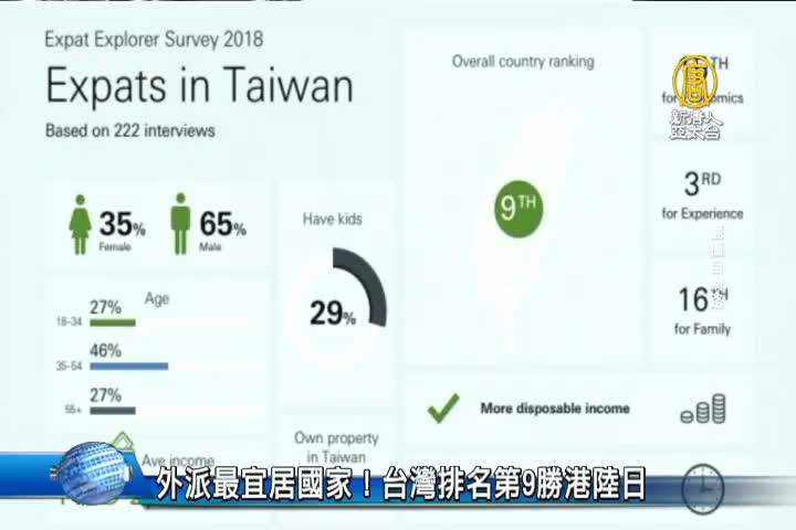 【新唐人亞太台 2018 年 10 月 19 日訊】來看到,由匯豐HSBC Expat發布外派最宜居國家的報告,台灣排名全球第九,調查指出,雖然台灣的薪資水平並不算高,但生活成本較低,大多數人財務狀況良好,有44%受訪者認為台灣幫助他們建立個人財富,44%的受訪者表示他們在台灣比以前更常在晚上或周末加班,但超過3分之1的人比以前更快樂。台灣的排名超過,香港、中國大陸與日本。