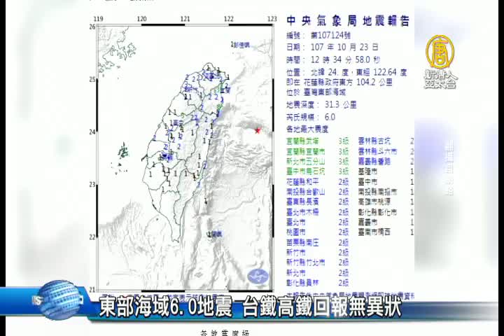 【新唐人亞太台 2018 年 10 月 23 日訊】地牛翻身,針對稍早12點35分發生的地震,氣象局表示,震央發生在台灣東部海域,芮氏規模6.0,深度為31公里,各地最大震度台北、宜蘭、台中3級。南投、台東、桃園、苗栗、新竹、彰化、雲林、嘉義2級,高雄、台南1級,稍早台鐵與高鐵都表示,沒有災情通報,沒有影響到營運。