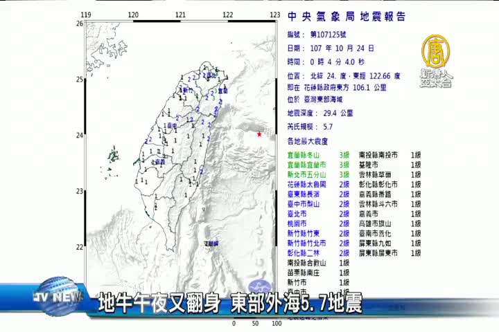【新唐人亞太台 2018 年 10 月 24 日訊】早安新唐人先來關心,地牛又翻身,觀眾朋友半夜有沒有被搖醒呢?就在今天凌晨0點4分,台灣東部外海再度發生芮氏規模5.7地震,大台北震度約1到2級,所幸全台沒有重大災情傳出。氣象局說,這起地震,是昨天中午地震的餘震。有中研院專家說,今年台灣已發生超過900次的有感地震,是歷年來的最高紀錄,但大部分都是小地震,不排除能量還沒有釋放完。而連續兩個規模大的地震發生,台北捷運不到12小時內,兩度將列車改為緩速行駛因應。