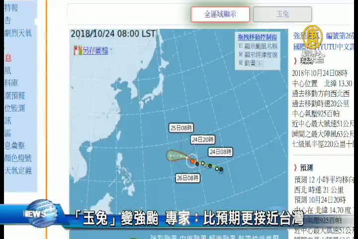 【新唐人亞太台 2018 年 10 月 24 日訊】來關心颱風消息!今年第26號颱風「玉兔」發展迅速,在今天上午增強為強烈颱風。氣象專家吳聖宇也在臉書形容:經過一夜,「玉兔」變身成了「暴力兔」。吳聖宇還提到,由於路徑持續偏西,雖然直接影響台灣的機會很低,但未來路徑將比預期的更靠近台灣才會轉向。隨著颱風接近,台灣下週一到週三,低溫可能降到 15、16度。