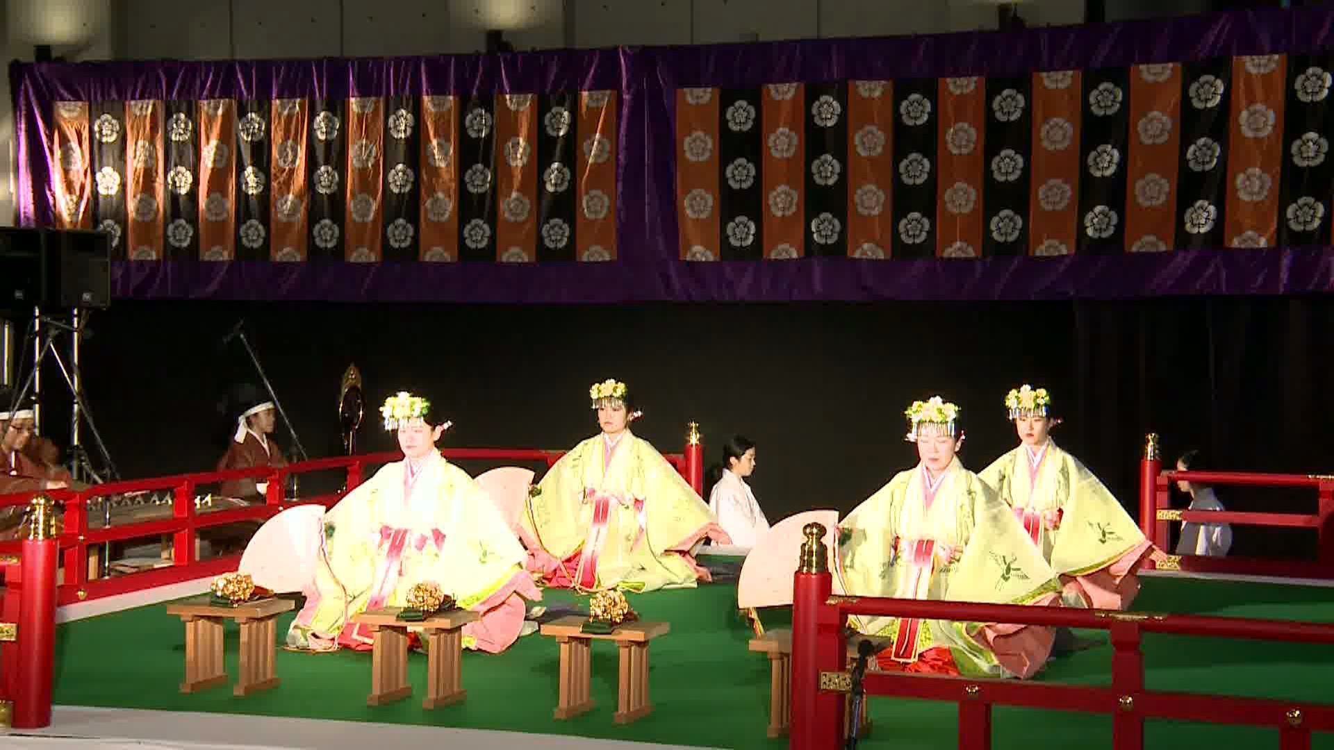 首先是由笙,數種笛子與鼓所奏,表達秋意的曲子;之後由4名舞姬身著以“十二單”為模型製作的華服,手持扇子,鈴鐺為祈求和平而舞。還有手持金戈,身著戎裝,英姿颯爽的少年翩翩起舞。整個表演肅穆,古樸,彷彿把我們帶回了日本的平安時代。
