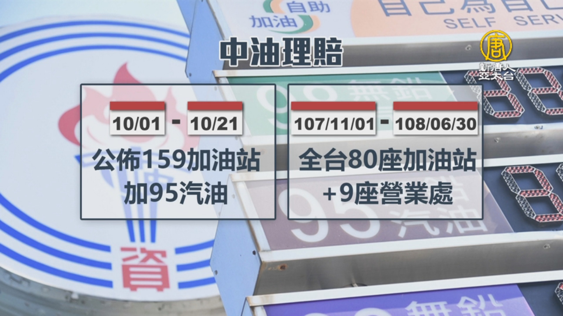 【新唐人亞太台 2018 年 10 月 25 日訊】中油桃園煉油廠,被驗出95無鉛汽油品質不合格,銷往北台灣159座加油站,中油敲定退一送一補償方案,從11月開始到明年6月底前都能申請,但只能在特定80座加油站辦理,駕駛人抱怨不便,而估計賠償金額27億,也被質疑是慷納稅人之慨!