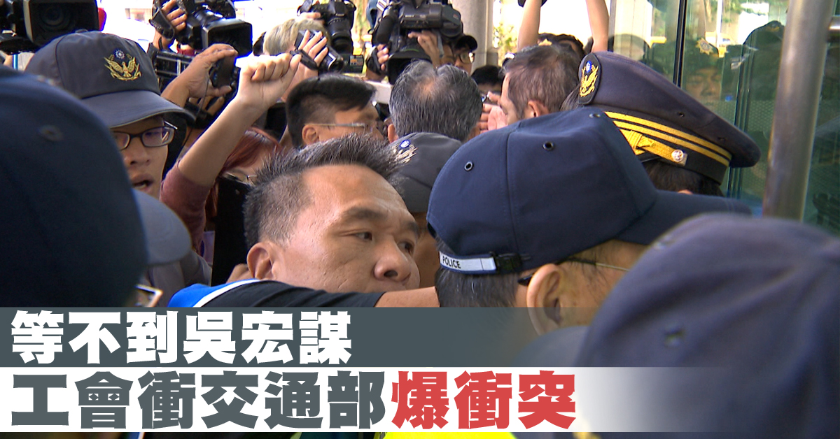 大批工會成員試圖闖進交通部,要見部長吳宏謀,和現場警力爆發推擠衝突。