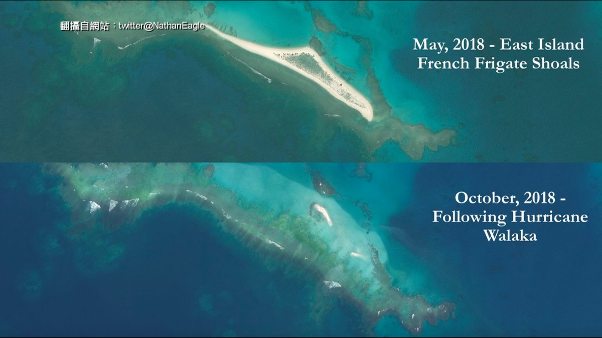 科學家透過衛星圖片證實,佔地11公頃的東島,瓦拉卡颶風過境後,已經被完全沖刷殆盡,也讓這些瀕危物種少了一個重要棲地,也讓夏威夷綠蠵龜與夏威夷僧海豹失去重要棲地。