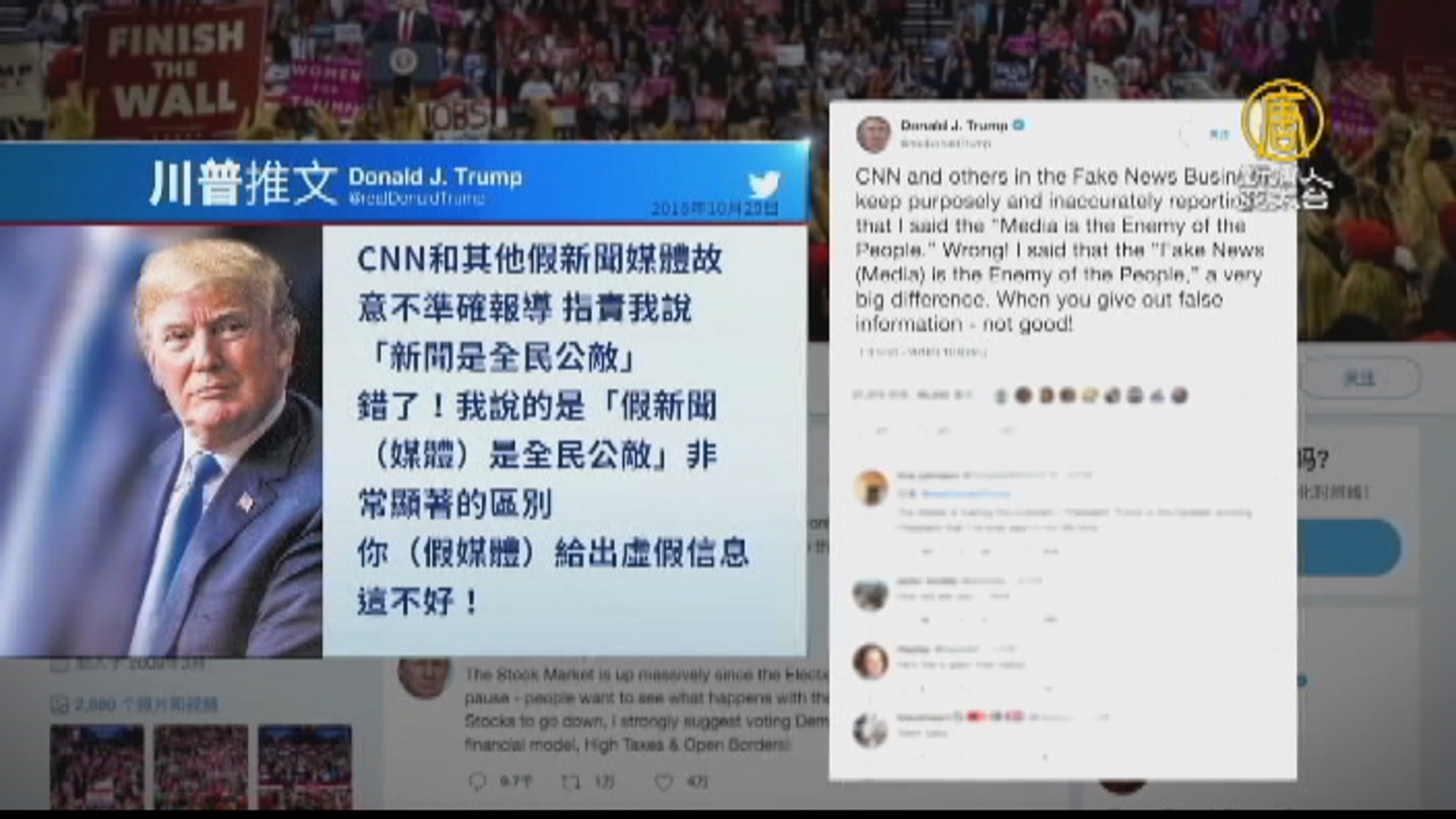推文說:「CNN和其他假新聞媒體故意不準確報導,指責我說「新聞是全民公敵」。錯了!我說的是「假新聞(媒體)是全民公敵」,非常顯著的區別。你們發布虛假信息,這不好!」