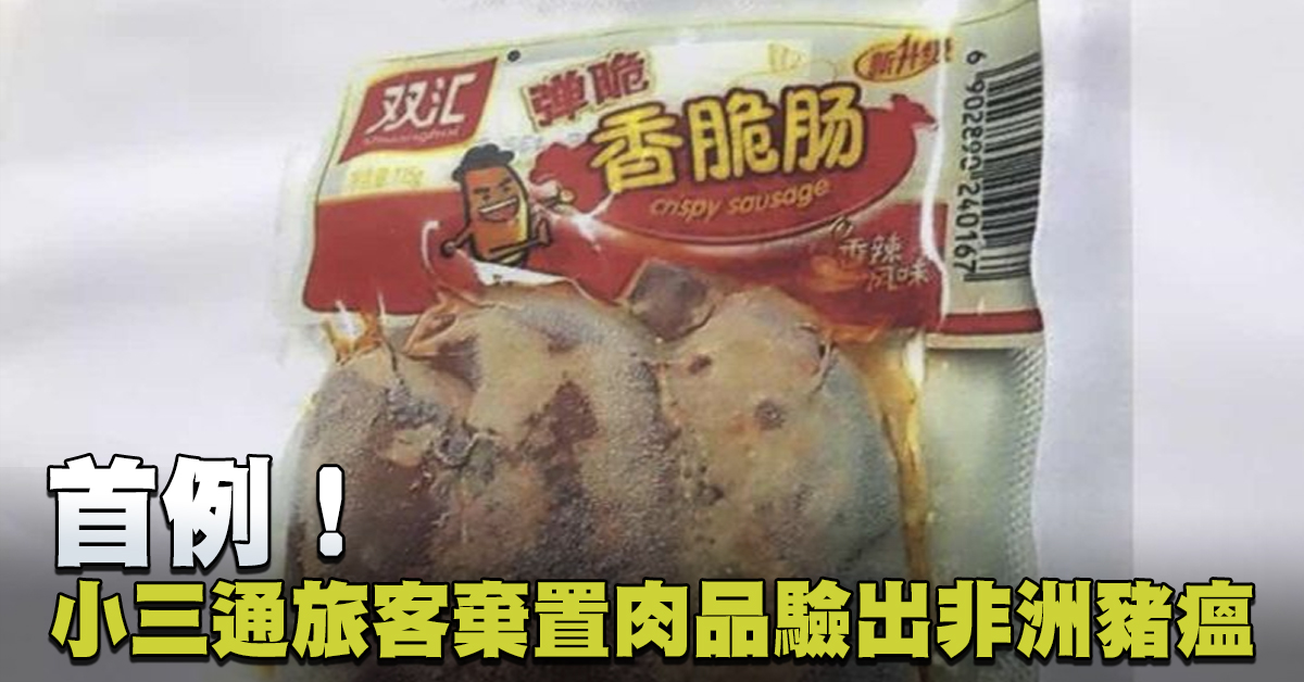 農委會宣布首例驗出非洲豬瘟病毒案例,來源是這一包中國製脆腸。有旅客經由小三通入關金門之前,丟棄在棄置箱當中。檢疫人員事後拿去化驗,竟然驗出非洲豬瘟病毒。