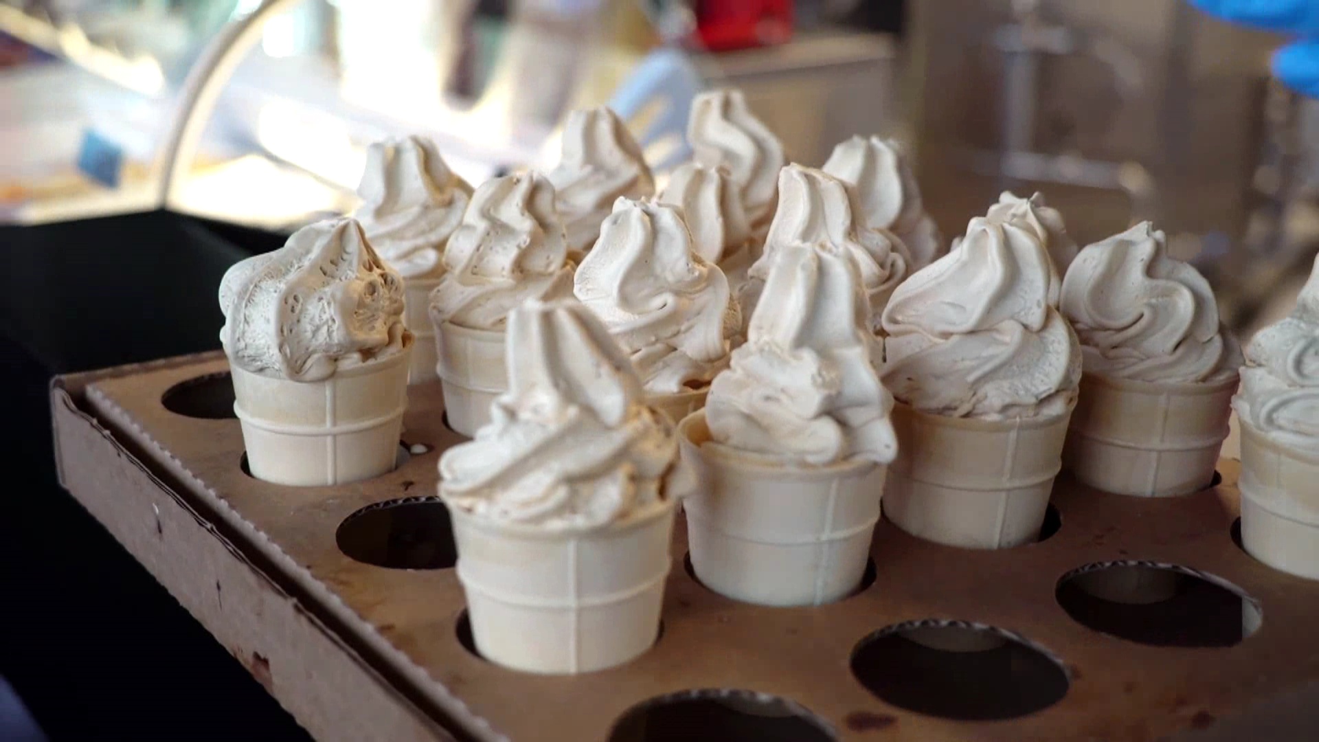 冰淇淋工廠員工 Julia Tkachuk:「和店裡出售的那種不同,這種更柔和,是甜食愛好者的最佳選擇。不停的吃,也不會凍嘴。另一個好處是,華夫餅外殼不會變軟,放到生產線上,只要3秒就能吃到。」