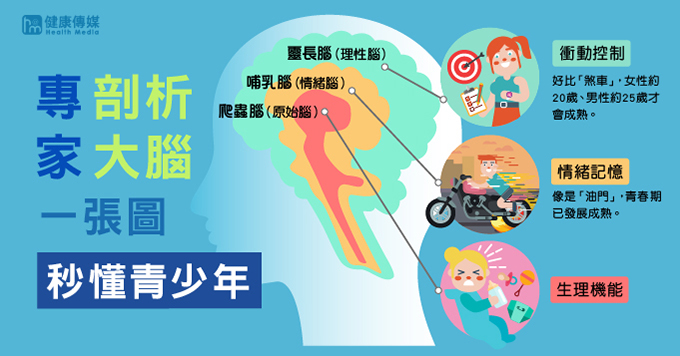 人類的大腦主要分成3個層面:最內層是爬蟲腦(原始腦),主管「戰鬥或逃」的本能,以及各種維生的生理機能。中間一層是哺乳腦(情緒腦),對應的解剖構造為邊緣系統,如杏仁核、海馬迴等,主管情緒相關記憶。最外層是靈長腦(理性腦),主管判斷、計畫、衝動控制,是演化到靈長類才有的腦區。理性腦屬「煞車」,女性大概20歲左右,男性25歲才會成熟;情緒腦則是「油門」,在青春期已經發展成熟,因此很容易在沒有深思熟慮的情況下,去做了一些事情尋求新鮮感,也會有很多離經叛道跟不可一世的表現。
