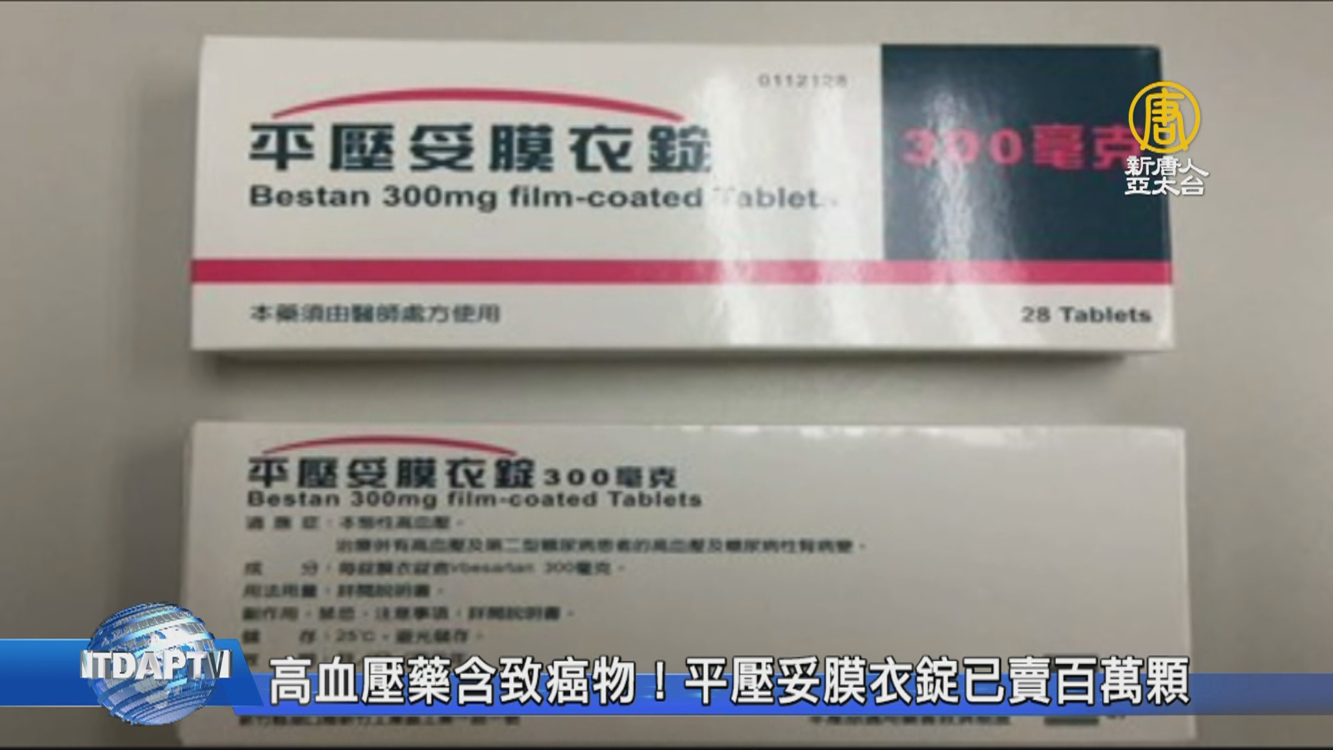 【新唐人亞太台 2018 年 11 月 03 日訊】高血壓藥又出包!2018年8月台灣才發現6款降血壓藥物,含有致癌成分「N-亞硝基二乙胺」並緊急下架後,現在再爆致癌藥,「平壓妥膜衣錠」,雖然公司已主動啟動回收作業,但這款藥在台灣賣出126萬顆。