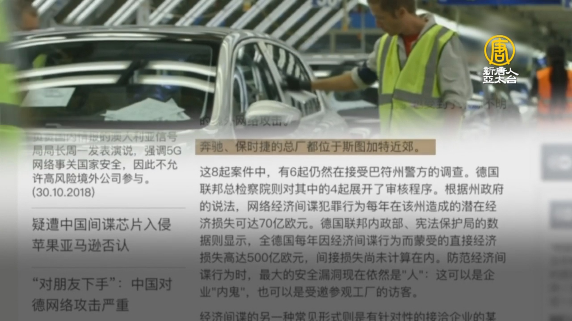 【新唐人亞太台 2018 年 11 月 06 日訊】德國政府單位曾多次警告:中共間諜正積極滲透社交網絡和政府部門等。近期,又有德國媒體指出,中共間諜疑似染指德國的支柱產業。