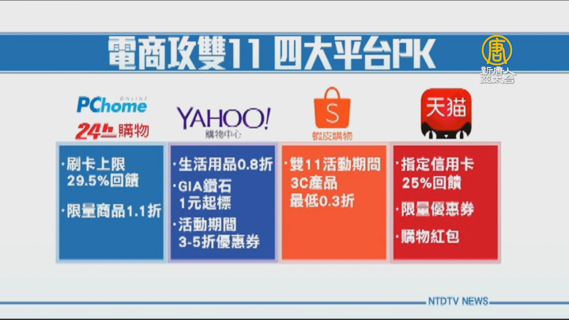 業者結合線上網路和線下實體店面,搶消費者荷包,戰場更加激烈,也讓電商網購平台,不敢大意。本土電商PCHOME推刷卡最高回饋29.5%,還有限量商品1.1折;Yahoo 購物生活用品0.8折,GIA鑽石1元起標,每天抽3-5折優惠券;蝦皮購物,主打3C產品最低0.3折;阿里巴巴集團旗下天貓,也來台推信用卡25%回饋,限量優惠券,還有購物紅包。阿里巴巴天貓台灣總經理 吳德威:「台灣市場,雖然已經很多年了,但是今年是最用力深耕的一年。所以我們是很希望,期待這一次雙11,能夠有個很好的結果,大家都來體驗一下新的服務。」
