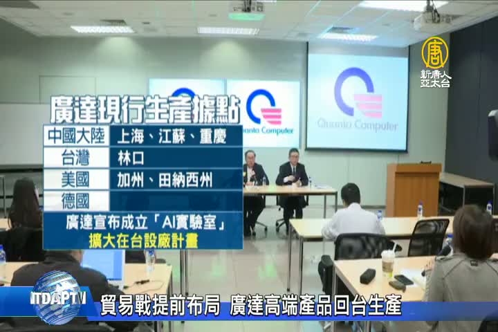 【新唐人亞太台 2018 年 11 月 13 日訊】美中貿易戰,讓產業供應鏈大洗牌,國內筆電、雲端伺服器大廠廣達,法說會上正式宣布,因應貿易戰影響,高端產品將移回台灣生產,而為了因應 AI 發展,還有貿易戰,廣達也計劃,在台灣大獵地擴廠。