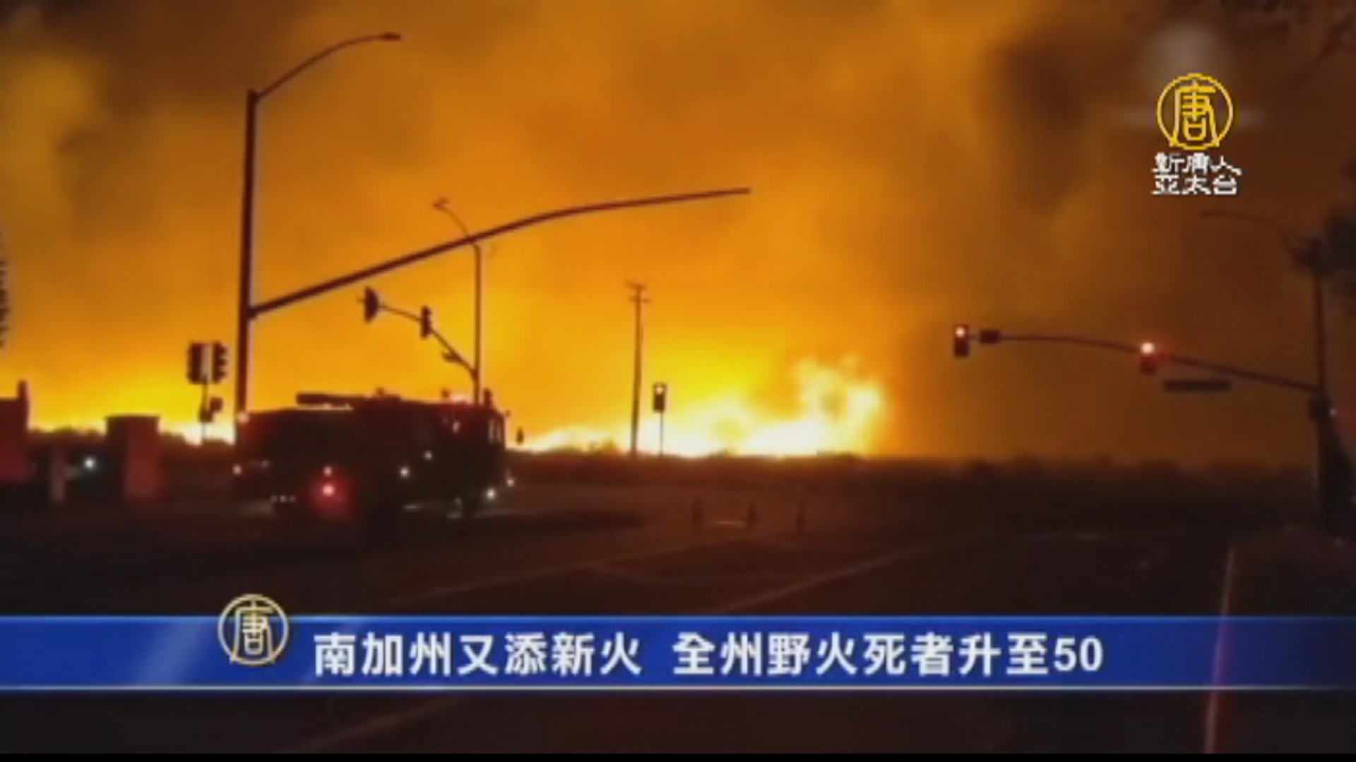 在北加州肆虐的「營地」野火和南加州的「伍爾西野火」,仍未得到有效控制。目前,「營地」野火造成的死亡人數上升到48人,整個加州已有50人不幸喪生。