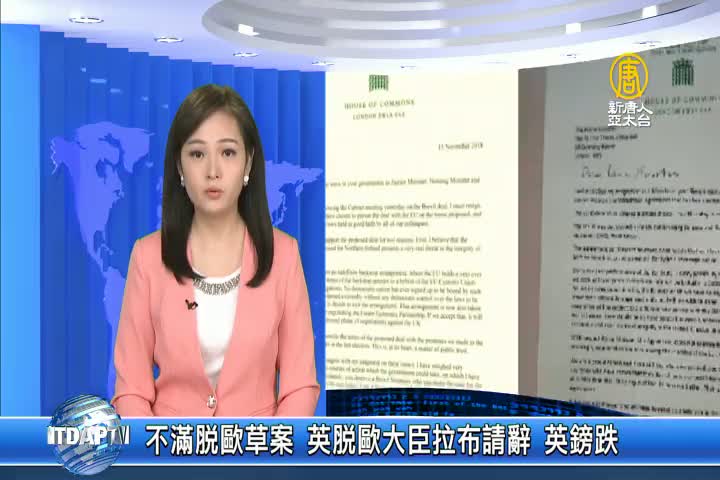 【新唐人亞太台 2018 年 11 月 15 日訊】今天的火線新聞,帶您看到,英國脫歐再生變數!英國內閣昨天才在特別會議中,同意脫歐協議草案,但英國脫歐大臣拉布,今天上午就拋出震撼彈,宣布請辭,表示他「無法昧著良心支持」脫歐協議草案。44歲的拉布,今年7月初才接任請辭的戴維斯,在職只有4個多月。除了拉布之外,北愛爾蘭大臣華拉,稍早也宣布,無法認同梅伊的草案而請辭。消息一出,英鎊兌美元應聲下跌超過1.2%。