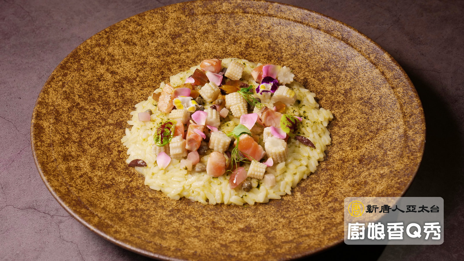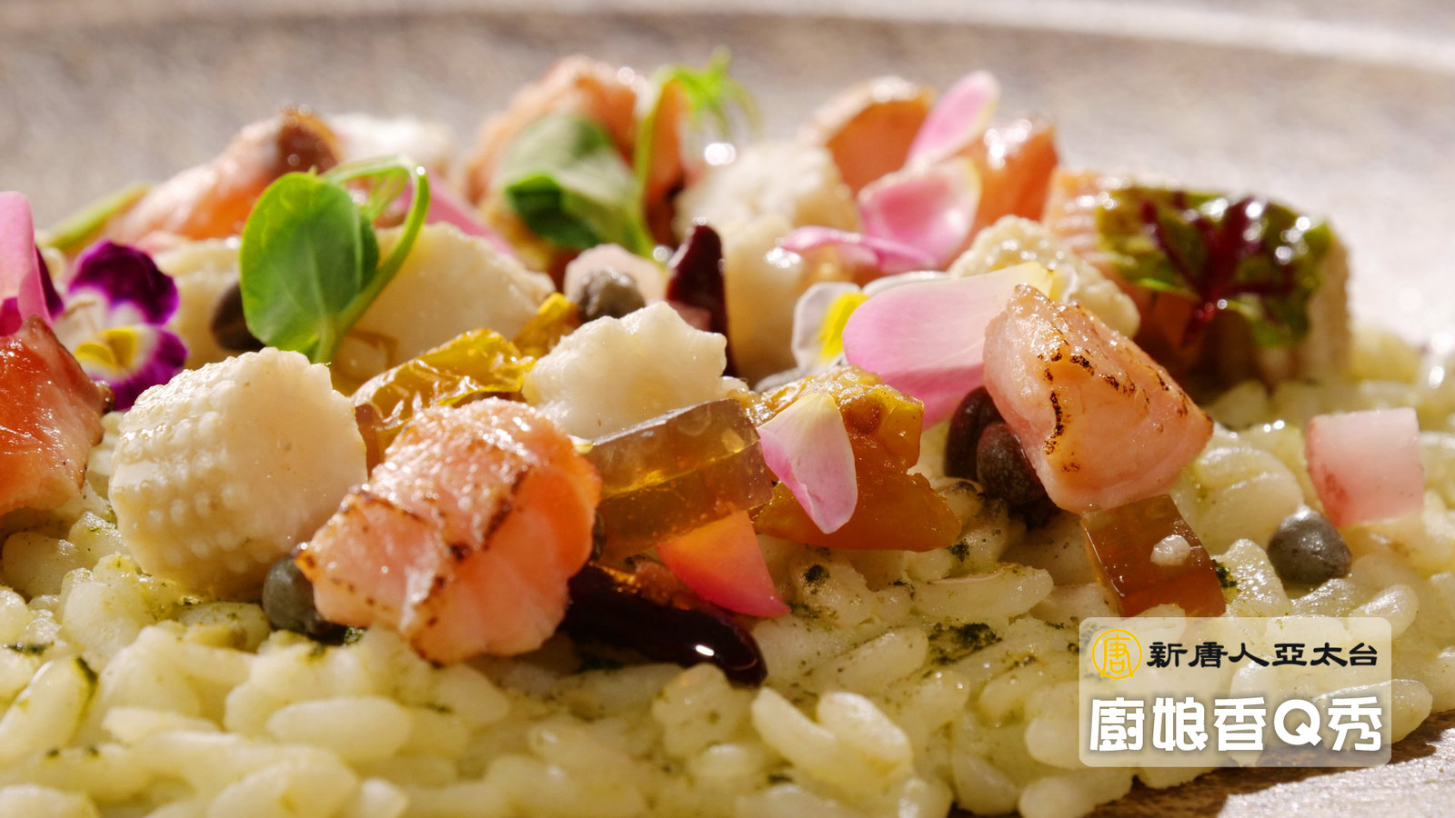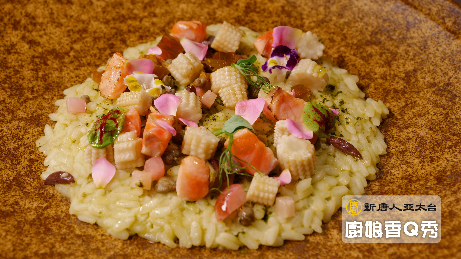 6.將燉飯盛盤,放上波菜粉、酸豆、橄欖、甜豆仁、玉米筍、蕃茄、柴魚凍等配料。裝飾食用玫瑰花,完成。