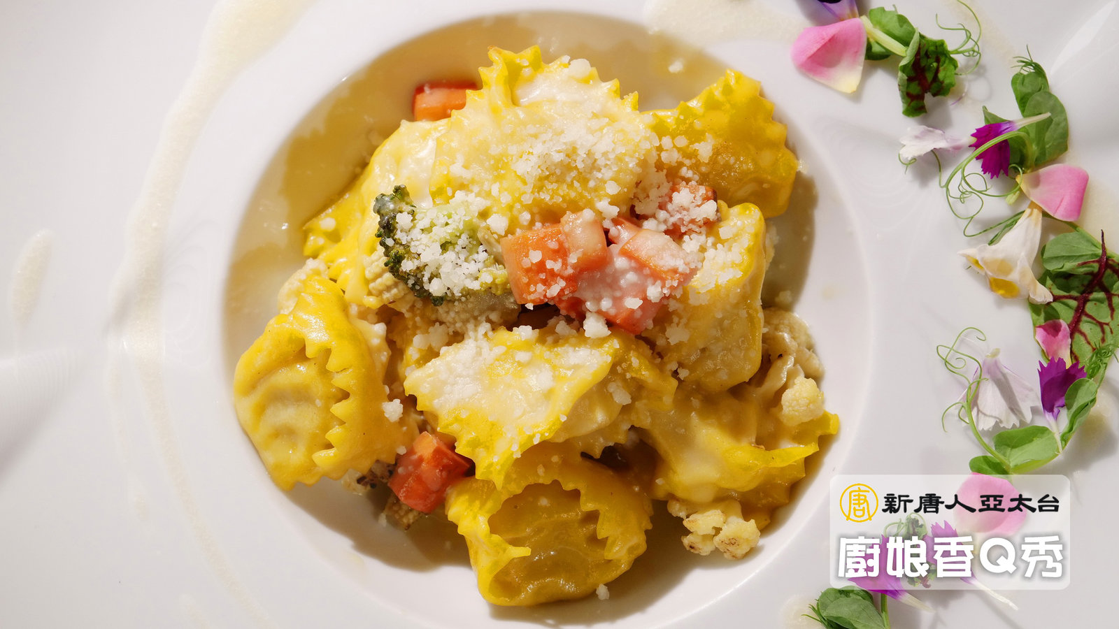 7.再加入起司粉跟起司醬。裝飾食用花,完成。