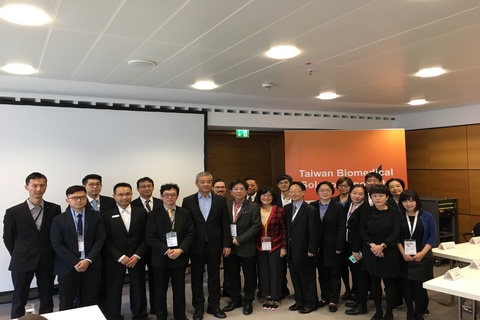 合照左起為唯醫生技顏正育製造總監、永康醫材吳欣育特助、台灣共振波程亭遠經理、美盛醫電陳長宏行銷副總、明基三豐鄒孝威特助、科技部次長謝達斌兼生醫產業創新推動方案執行中心執行長、法蘭克福經濟組黃青雲組長、博錸生技Aidan Coe國際行銷處長、財團法人金屬工業研究發展中心林志隆副執行長、醫百科技黃大可董事長、清大國際產學營運中心張大慈教授、清大國際產學營運中心吳仁貴協理、清大國際產學營運中心林琮庸營運長、豐康微流體晶片黃雅苓執行長、路提科技莊舒蓁營運長、經濟部生醫推動小組林季玫組長、財團法人生物技術開發中心黃