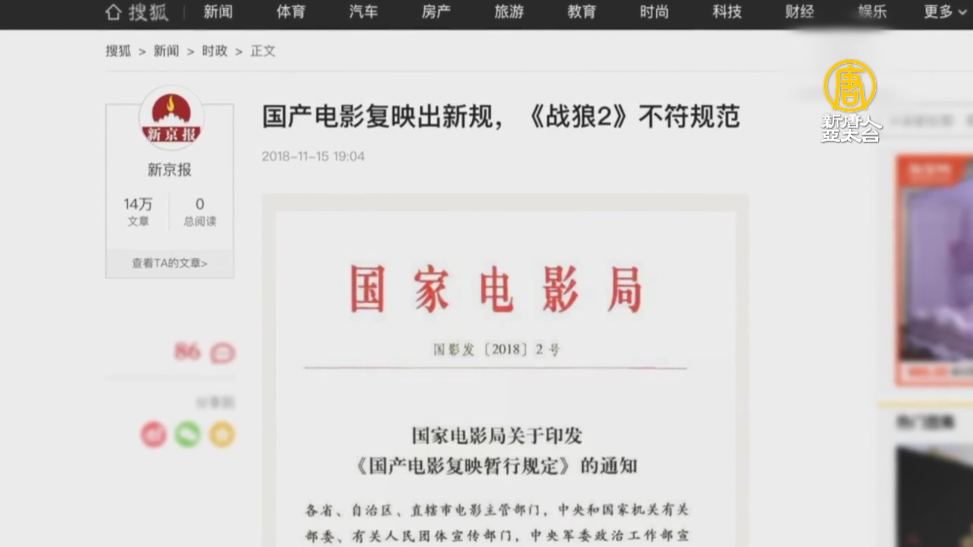 【新唐人亞太台 2018 年 11 月 17 日訊】中共國家電影局近期下發了規定,將從12月起對國產電影的復映進行管控。原被稱為「主旋律」的《戰狼2》復映片,被黨媒特別點名說,「不符合規範」。來看報導。
