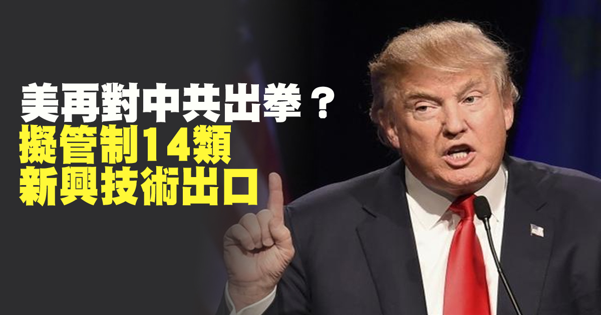 美國商務部工業安全署,19日發佈出口審查管制框架,列出14類領域,包括生物技術、人工智慧、機器學習以及先進監控技術等敏感高科技,預料中國將首當其衝。