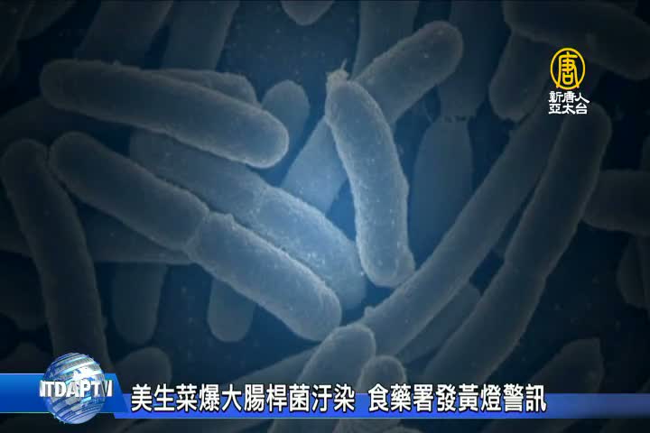 【新唐人亞太台 2018 年 11 月 22 日訊】歡迎回來。喜歡吃生菜沙拉的人要注意了,美國爆發蘿蔓生菜遭大腸桿菌汙染疫情,已經有32起病例,感染了大腸桿菌,美國食品藥物管理局(FDA)也呼籲民眾避免食用。台灣衛福部食藥署(TFDA)昨天也跟進美國,對於美國生菜發出「黃燈」警訊,意指提醒民眾注意。食藥署今晚宣布美、加進口的蘿蔓生菜須附食安證明才可進口,並呼籲民眾建議不要生食該產地蘿蔓生菜或煮熟再吃。赴美加旅遊時,減少食用生菜,避免感染的風險。