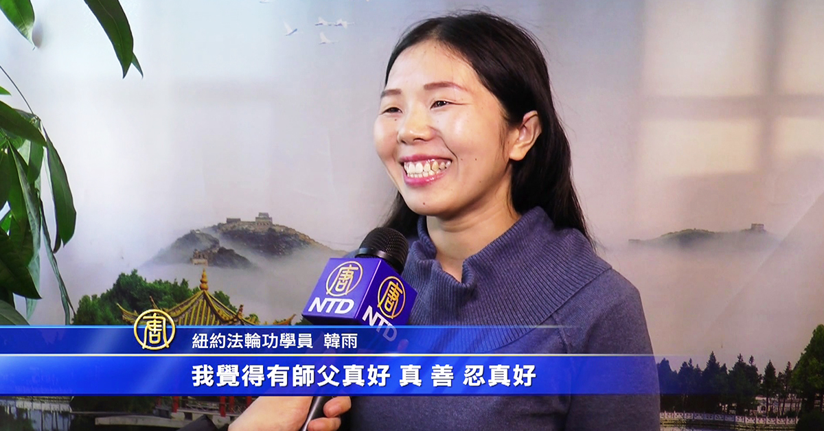 紐約法輪功學員 韓雨:「過往那種痛苦、那些無奈、絕望的那種情緒好像離我都遠了。從沒有過的那種平靜、幸福,我覺得有師父真好,真、善、忍真好。」