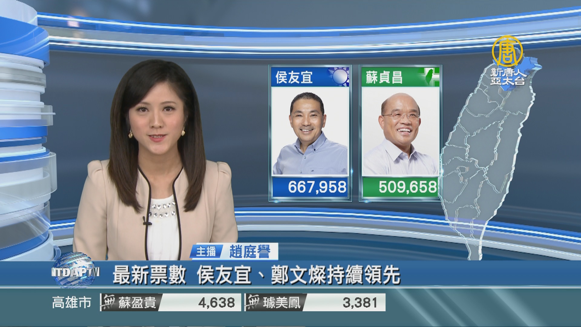 【新唐人亞太台 2018 年 11 月 24 日訊】馬上來看到,目前開票的最新情況,來看到新北市長部分,國民黨候選人侯友宜的票數現在是56萬147票,民進黨候選人蘇貞昌的票數是來到42萬3千942票。|繼續來看到桃園市長的部分,首先來看到,現任的桃園市長鄭文燦的票數已經大大的拉開距離,來到23萬6千984票,國民黨陳學聖,票數來到16萬8千362票。另外,脫黨參選的楊麗環目前745票。